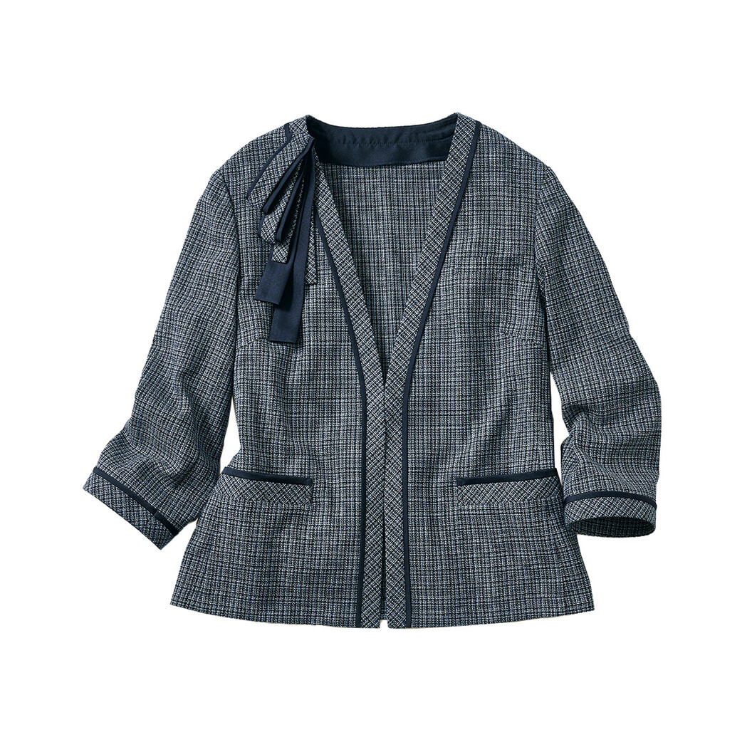 華やかなラメとラグジュアリーな雰囲気でおもてなしにも最適なノーカラーサマージャケットです。ツイード素材なのにザラザラしない肌なじみの良い風合いで、深めのVネックは顔をシャープに見せる縦長効果があり、肩パッド、裏地無しの仕様は軽い着心地で、通気性も抜群です。右衿のコサージュはクリップで取り外し可能で、羽織りやすいゆったり目のシルエットとなっています。右衿内側にはクリップ用アクセサリーホルダー、左胸にネームホルダー付き、右中央はカギホック留め、ポケット内布には抗菌・抗ウイルス加工付きです。家庭洗濯が可能です。