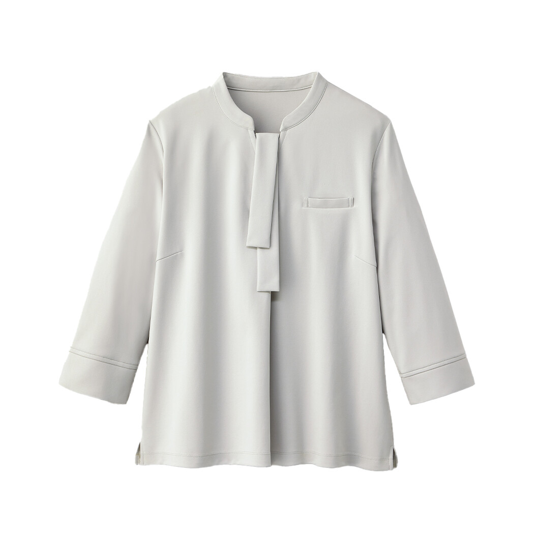 ジャケットやベストに合わせやすいデザインの七分袖カットソーです。なめらかさとソフトな風合いが特徴です。淡色でも透けにくく1枚でも美しく着用できます。フロントタックデザインはお腹周りのラインがひびきにくく、優れたUVカット性と汚れが落ちやすい加工付きで清潔感を長くキープできます。ボウタイリボンは取り外し可能な2WAY仕様、リボンを外すと首元はキーネックデザインでシャープな印象に早変わりします。内側にはインナーのチラ見え防止用の隠しボタン付きです。左胸ポケットに内側ネームループ付き、脇裏面に汗脇パッド付きです。グレージュ、ネイビーの2色展開あります。家庭用洗濯が可能です。