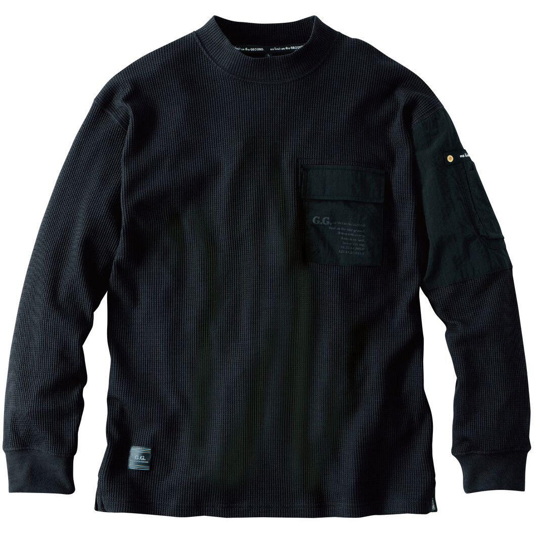 変化を加えた異素材使いが新しい。ビッグシルエットでざっくり着られるモックネックワッフルTシャツ。ヘビーウエイトなT/Cワッフル素材を使用。モックネック仕様。不快なニオイを軽減するデオドラントテープ付き。