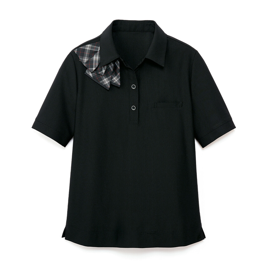 エレガントかつ甘すぎない、きちんと見えするポロシャツです。心地よいストレッチ性とさらりとした肌触りのニット素材。シャープな襟元で、リボンはシックなシャドーチェック柄。トラッドな華やかさを添えるチェック柄リボン付き取り外し可能です。内側脇下に消臭テープ付き。上質なハリ感がありながら、心地よいストレッチ性もありシワになりにくいニット素材。同素材のリサイクル・ニットシリーズとのボトムスとの組み合わせがおすすめです。再生ポリエステル糸を使用したエコ素材で、地球にやさしいです。