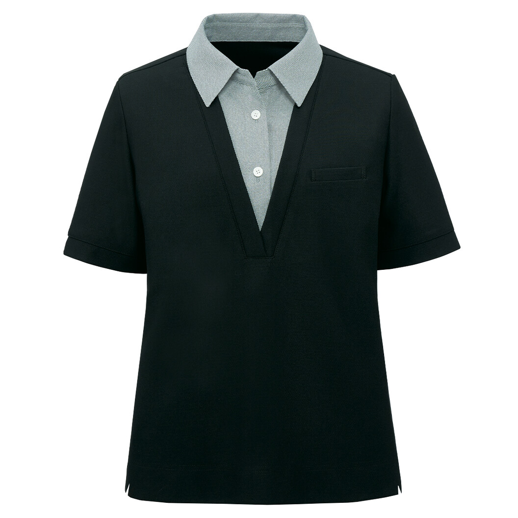 重ね着風のポロシャツです。再生ポリエステルを100%使用。深めV開きのデザインが大人っぽさを演出。シャツカラーの衿元は顔まわりを明るく見せ、首元の深めV開きのデザインが大人っぽさを演出します。他社のリボンにも対応可能です。内側脇下に消臭テープ付き。上質なハリ感がありながら、心地よいストレッチ性もありシワになりにくいニット素材。同素材のリサイクル・ニットシリーズとのボトムスとの組み合わせがおすすめです。廃棄衣料から生まれた再生ポリエステルを100%使用したエコ素材で、地球にやさしいです。