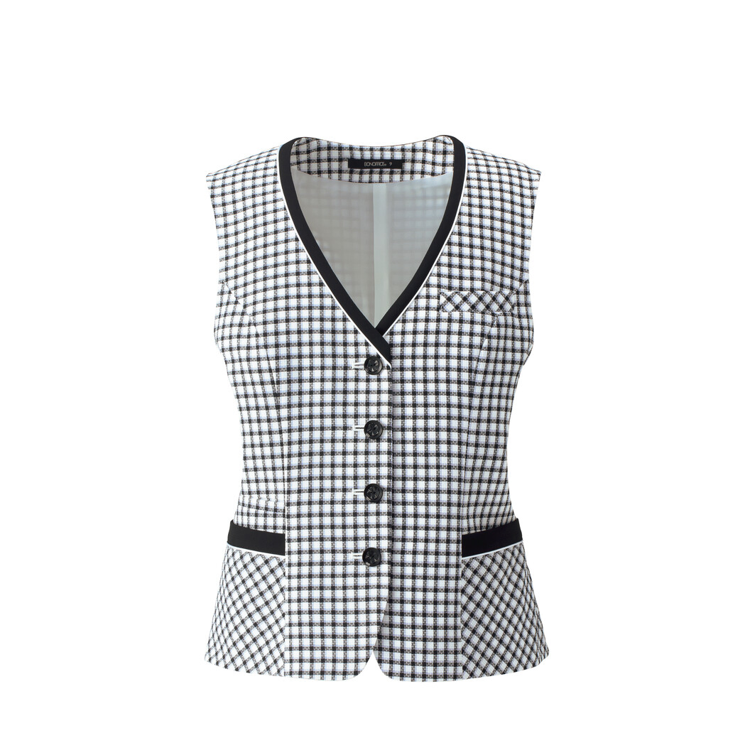 Relief Check 清涼感×キレイ見えを実現! さらさらとした風合いで、夏でも快適な着心地が魅力。清涼感のある差し色やフラワーモチーフのボタンなど、清楚で可愛い印象を与えます。バイアスの切替え、黒のトリミングでメリハリをつけたデザインです。 ベスト