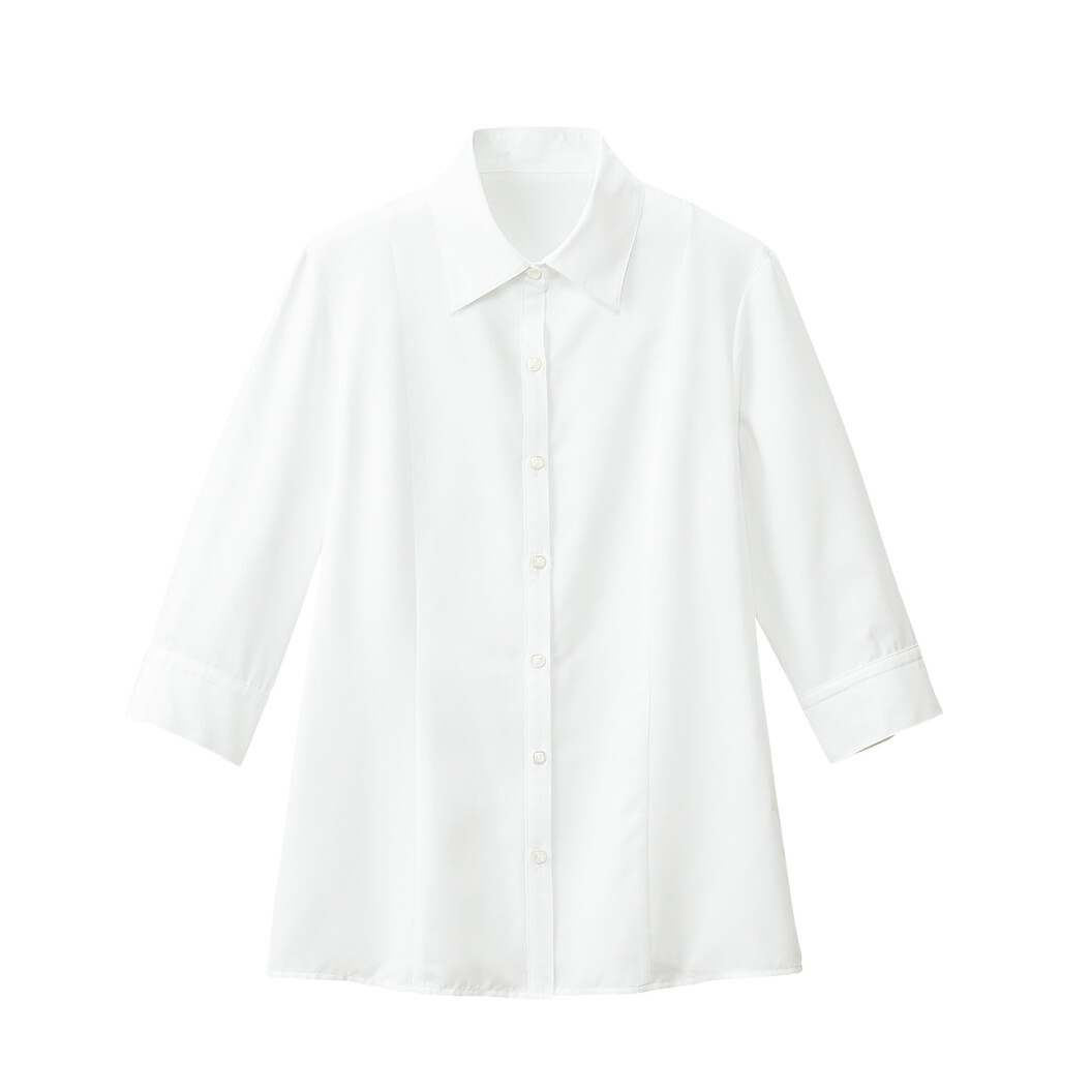人気の七分袖ブラウスです。袖まわりの汚れを気にせずオールシーズン着用いただけます。このブラウスには「透け防止」の生地を採用しているので、人目を気にせずジャケットを脱ぐことができます。ベストやスカート、パンツと合わせてもごわつかずにスッキリと着こなすことができます。飽きのこないシンプルベーシックなデザインなので、長く愛用いただけます。おうちで洗濯してもすぐ乾き、面倒なアイロンがけなしでもシワになりづらいのが特徴の七分袖ブラウスです。