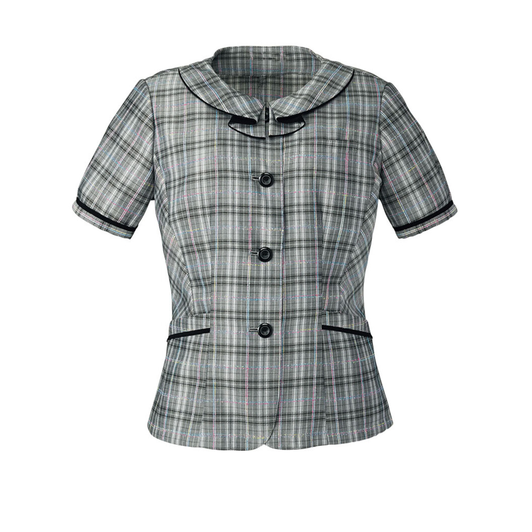 細見え効果でスタイルアップのオーバーブラウスです。グレーのレインボーチェックで、できる女性にふさわしいスタイルに。白ステッチがポイントのボタンと袖口はタックでふんわり、腕がスッキリ見える効果もあります。見た目に負けない動きやすさのオーバーブラウスです。表情が華やぐ変わり襟のフェミニンマジック。ふんわり柔らかな印象の襟の裏地に、ブラックの生地を使用しています。緑取りのように見えるので、より華やかな印象を演出できるオーバーブラウスです。