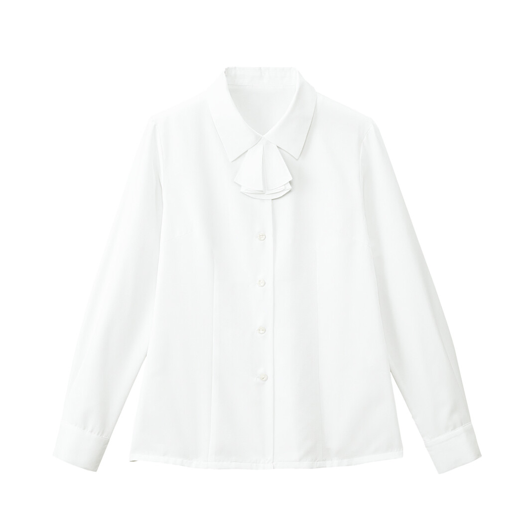 パウダータッチの角襟×ダイヤ柄の長袖ブラウスです。襟元のフェミニンなリボンは取り外し可能なので、TPOに合わせて自由にコーディネートしていただけます。透け防止機能がついているので、透けるのを気にせず、安心して着用ができるのも嬉しいポイントです。おうちで洗濯してもシワになりづらいため、面倒なアイロンがけもいらない抜群のイージーケア性で毎日のお手入れが楽チンに。忙しい毎日にもピッタリな人気の長袖ブラウスです。