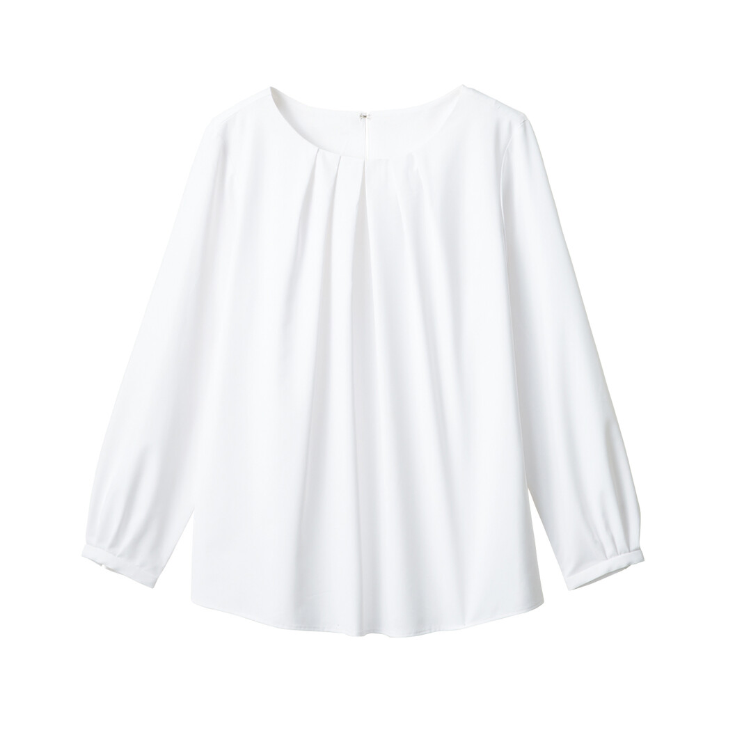 しなやかな素材の長袖ブラウスはフロントにタックを施して立体的な奥行きを出し優しげな表情に。1枚着として透けないことはもちろんのこと、パンツとのコーディネートやスカートにINのスタイルが可能です。スーツのインナーにも合わせやすいので、コーディネートが増える使い勝手のいい長袖ブラウスです。後ろホック留めなのでシルエットが綺麗で美しい長袖ブラウスです。ストレッチ性に優れているので動きやすく、長袖なのでオールシーズン着回せるので、幅広いコーディネートが楽しめるブラウスです。