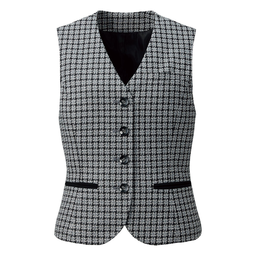 端正なブラックの千鳥柄ベストです。ポリエステル79%、毛19%、ナイロン2%のパフィーハウンドトゥースという素材は厚めのしっかりした生地なので、保温性があり、あったかいです。シルバーの輝きがキラリと光るフラワーボタンが特徴です。千鳥柄で魅せるクールビューティーなスタイルを演出できるベストです。おうち洗濯できるのでいつでも清潔な状態を保つことができます。さりげない細部にまでこだわり尽くした女心くすぐる千鳥柄のベストです。