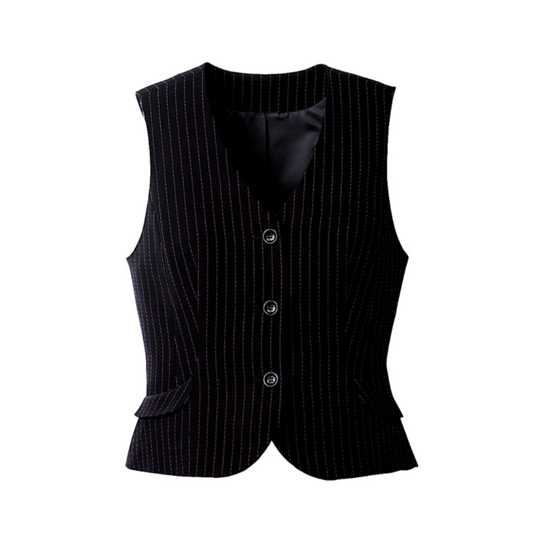 端正な印象のストライプベストです。ポケット部分にはバイヤス使いのフラップ風の深めのデザイン。バイカラーストレッチストライプのベストです。ストライプ柄なので縦長スリムに見える効果もあります。ストレッチが効いてるので着脱ラクラクで、腕を伸ばしたりする動作など、ちょっとしたしぐさにもしっかりとサポートしてくれます。豊富なボトムスと組み合わせて、好みのセットアップが作れます。曲線美を生かしたデザインで凛とした女性に見せるベストスタイルです。
