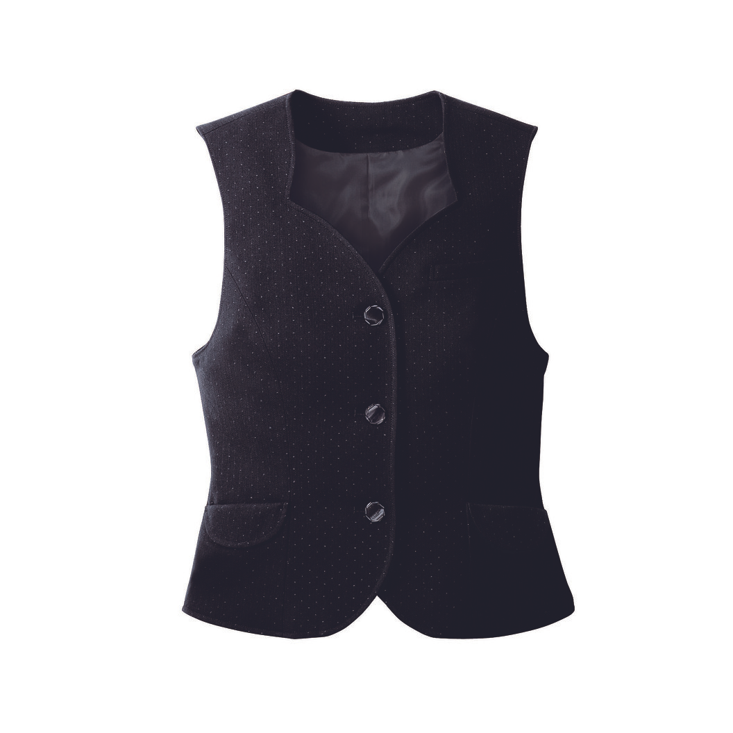 品よく煌めくドット柄とエレガントなスカラップ襟の組み合わせが華やかなベストです。両サイドにあるポケットは、飾りフラップの上がポケット口で、深めのポケットだから収納力もバッチリです。衿元はスカラップのカッティングでキュートで華やかな印象になります。おしゃれな2つのボタンが後ろ姿のアクセントになります。繊細なレリーフを施したボタンと、接客にふさわしい品格のあるヘリンボーンの生地とキラキラドットがマッチングしたベストです。