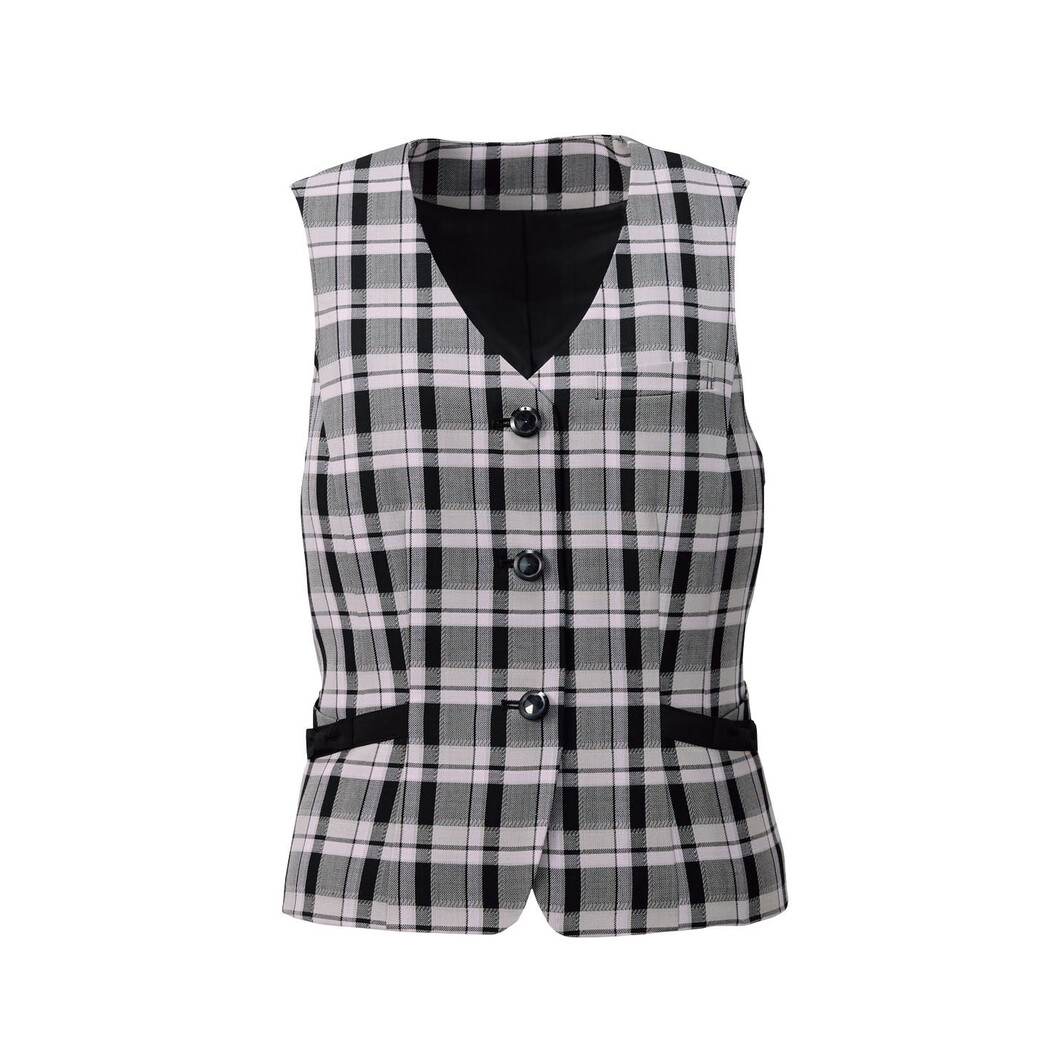 やさしいピンクに黒を効かせた大人チェック柄のベストです。2重構造になっている左右のポケットはスマートフォンがすっぽり収納でき、その上には小分けポケットをオン。斜めの入れ口、黒リボンで細見えの効果もあります。右内側には、印鑑専用のミニポケットもあり、収納力は抜群です。サイズ調整可能なウエストベルトはリボンのカタチになっており、後ろ姿もしっかりかわいく見せます。お花のカッティングを施したボタンなど、細部にまでこだわった完成度の高い正統派タータンチェックベストです。