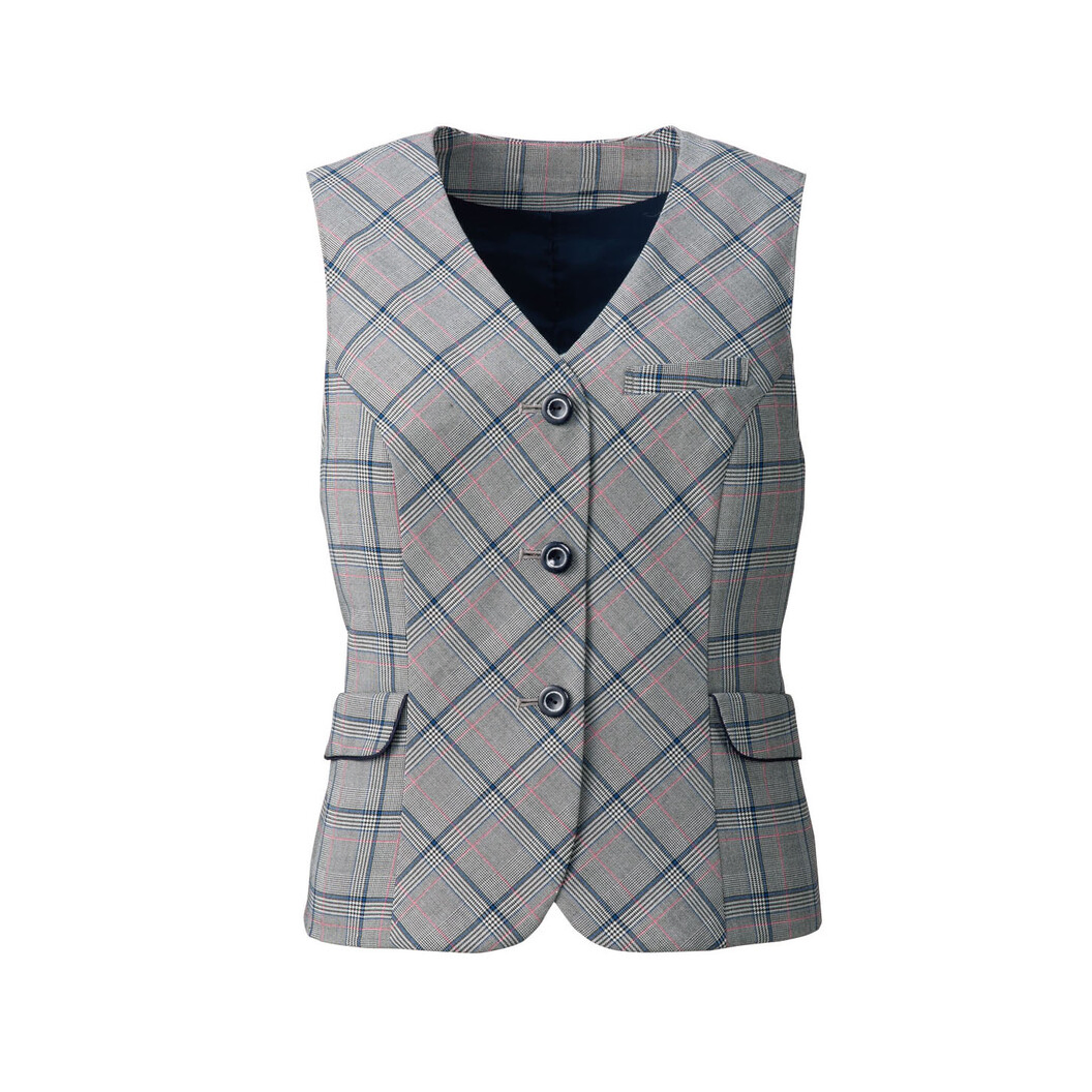 しっかりとした透けにくい生地で柔らかいエリを濃紺で縁取りコントラストをつけたベストです。ウールライクな表情が印象的なチェック柄は3種類の異なる糸を使用しています。アクセントに明るいピンク色を加えることで、ベーシックな柄に表情をプラスしたベスト。軽い仕様でありながらキチンと感のある印象になります。少し抜けた感じの甘いカッティングは女性らしさを引き立てます。ウエストのフラップポケットは収納性抜群の二重構造になっています。上品なベストです。リボンブローチの有無で印象が大きく変わります。外した状態ではシンプルで大人っぽい印象に。リボンをプラスすることで適度な甘さを演出します。トラッドな中にもエレガンスの要素を加えたベーシックなアイテムだからこそ実用性と細かいポイントにこだわったベストです。