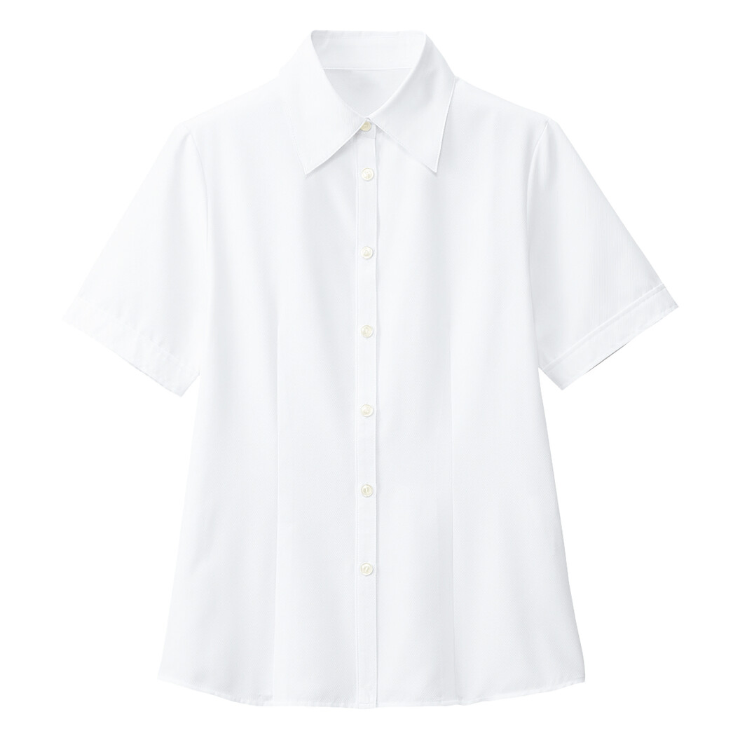 ジャケットを脱いでも透けにくい白ブラウスです。透け防止生地を採用のシャツカラーは女性の強い味方です。下着選びにも悩むことはないのでそれだけでノンストレス!こちらは半袖タイプですが、同じ素材の長袖タイプもあるので季節や用途によって使い分けも可能です。家庭で洗濯してもシワになりづらく乾きやすい素材を使用しているので、アイロンなしで着用できます。シンプル、ベーシックな飽きのこないデザインなので、長く愛用することができる人気の高い白ブラウスです。