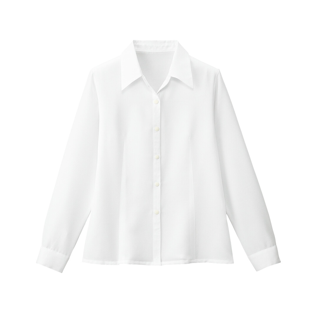 正統派のシンプルで無地の長袖ブラウスは、文句なしの王道ワークスタイルです。肌に張り付かないサラサラのワッフル生地の「マイクロチェック」を使用しています。おうちでも洗濯可能なので、いつでも清潔な状態を保つことができます。スタンダードなデザインの定番のブラウスはON、OFF問わず使えます。小さいサイズから大きいサイズまで幅広く豊富なサイズが揃っているのも嬉しいポイント。開襟タイプなので首回りのデコルテを美しく見せることができる長袖ブラウスです。