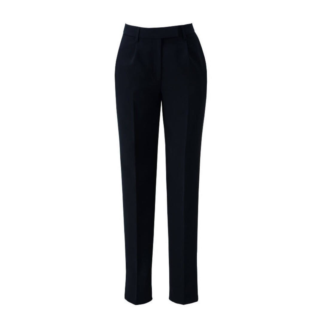 BeautyKeepSuitsのアイテム。動きやすさと美しいシルエットを叶えるテーパードパンツです。 裾にかけて細くなる美しいテーパードシルエットで、エレガントでスタイリッシュな印象に。 フロントのタック〜センタープレスをつなげてIラインの脚長効果で、1タック入りでヒップ、腰まわりにゆとりのあるパターン設計です。 後脇ゴム入りで立っても座っても着圧が変わらず、動きやすい仕様です。 ゴムは3cのアジャストなので、着用時にゴム下のギャザーは目立ちません。 ポケットは前後共に大容量タイプで、後ろポケットは箱ポケット仕様で手袋などを入れた時も口が開きにくい仕様です。 ウエスト部分の持ち出しベルトによってジャケットの前端の隙間も美しく、内掛けボタンカバー付きでボタン跡も気になりません。