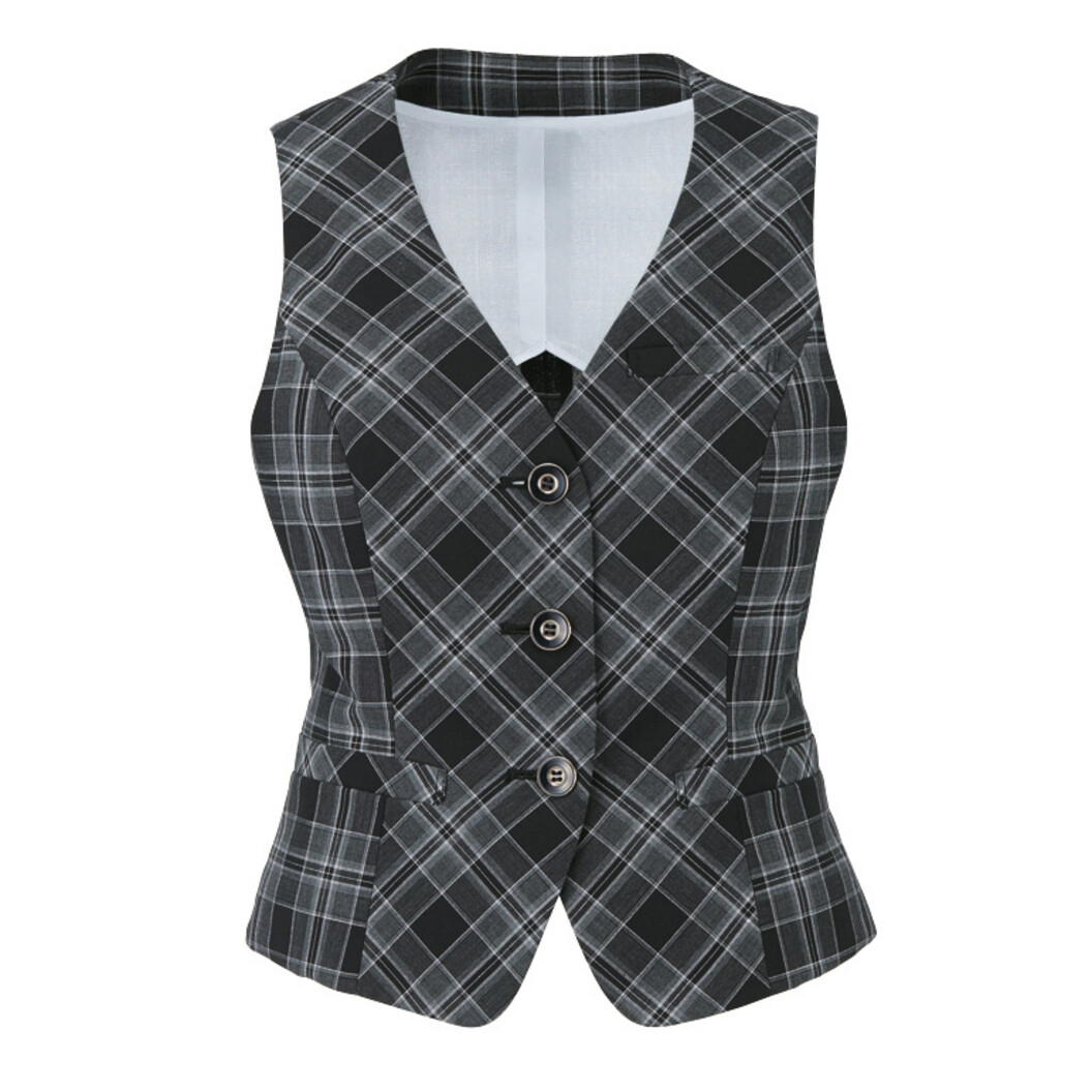 バツグンの通気性とさらりとした肌ざわり。ラメの輝きをプラスしたベストです。 かっこよくて女性らしい、透明感たっぷりのチェックブラック×ミックスグレー×シルバーラメを活かした、ENJOYオリジナル素材。 クリアな印象を与えるモノトーンチェックが、かっこよさと女らしさの絶妙なバランスを表現しています。