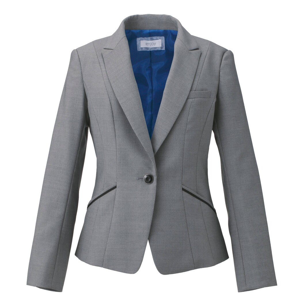 人気ドット柄でスタイリッシュに。しなやかな風合いと上品な光沢が魅力のジャケットです。 S字曲線美がつくりだす、姿勢美と痩身錯視効果のある女性の艶やかさ香るジャケット。 多面体のパネルテクニックで、曲線美シルエットを実現しました。 誰が着ても、どの角度から見てもスラッとかっこよく、1サイズスマートに。 更に、窮屈感がなく腕を上げたときも快適なenjoyARM360°&どんな腕の動きにも対応するシークレットARMで動きやすさをフォロー。 ポケットのグログランテープがアクセントに。