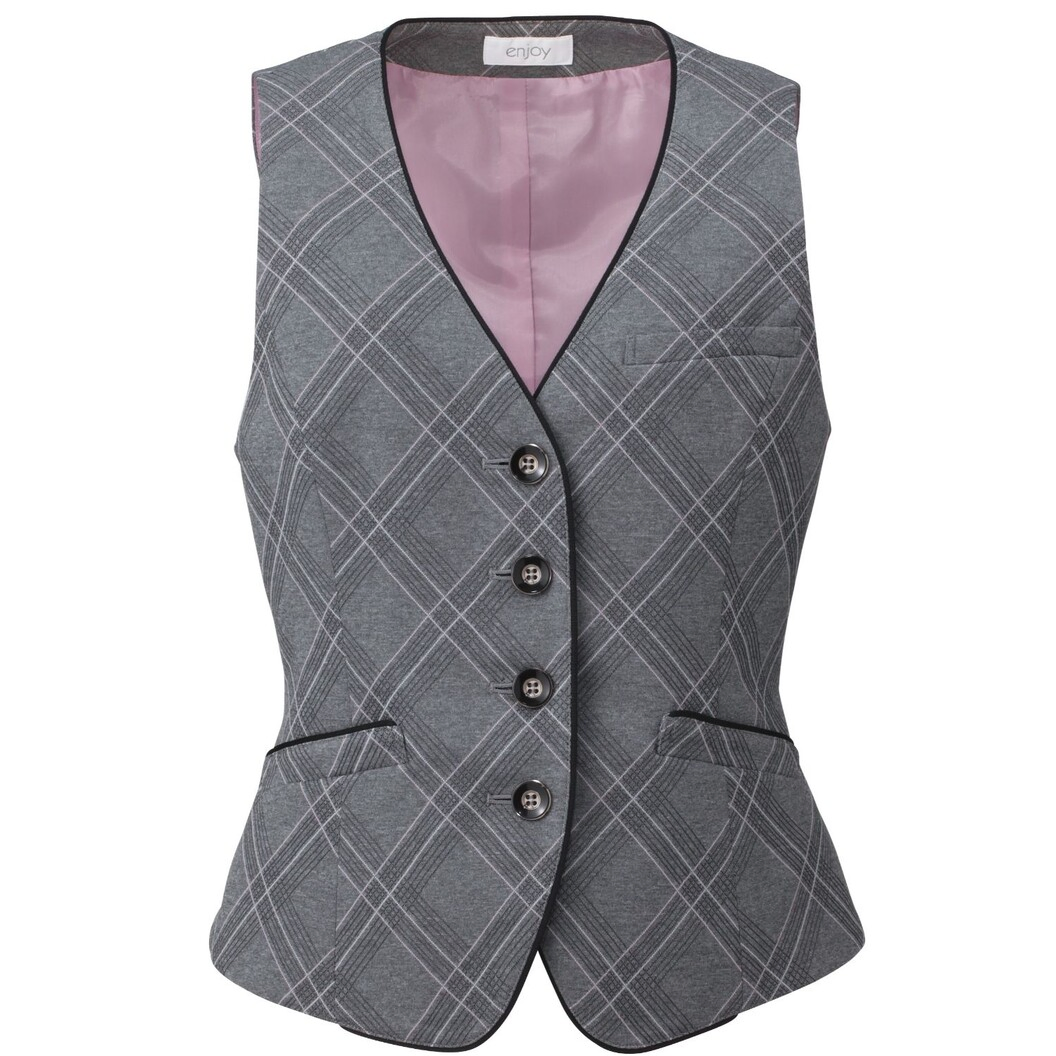 空気のようなフィット感!クールとフェミニン2つの個性のニットベストです。 大きめチェックもバイアス使いでスッキリ見え、更に前端のパイピングが引き締め効果を生み出します。 4つボタン仕立てで、ベストの横ジワを解消。 素材は、シワになりにくい回復力に優れているため型くずれしにくく、長時間着用しても着崩れません。 ベルト風の切り替えデザインにスリット仕様でメリハリのあるバックスタイルに。 バイアスチェックを軽やかに仕上げたニットが特徴です。
