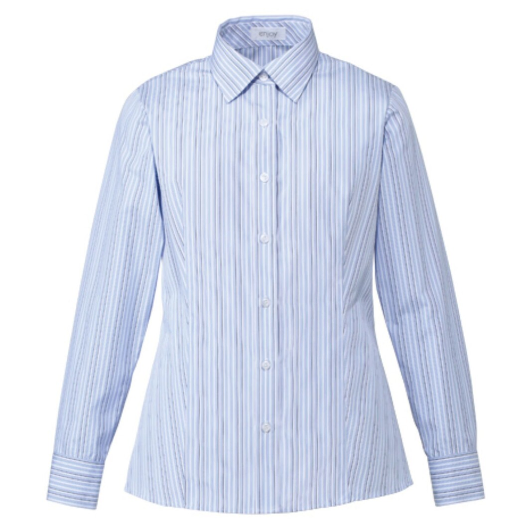 スタイリングの幅が広がる知的でスマートなストライプシャツです。 衿腰を高めにした、シャープでかっこいい立ち衿のパターンで、着こなしをワンランクアップ 動きやすさ抜群で着くずれしにくい、enjoyARM360°搭載 スカーフループ搭載(実用新案登録番号第3186092号) バストケアボタン搭載 調節可能な袖口ボタン