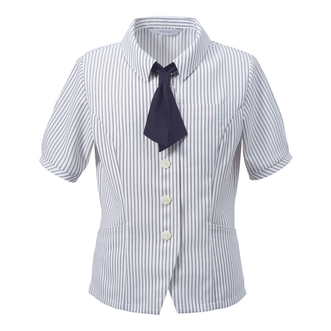 薄手で涼しく透けにくい「ライトブラウス」。 ブラウス1枚で、きちんと見える、夏が似合う涼しげなストライプで、健康的な女性らしさを表現しました。 汚れが落ちやすい防汚加工&汗のニオイを防ぐ抗菌・防臭加工で、清潔感アップ! ブラウス感覚で着られて1枚できまり、とにかく涼しい「ライトブラウス」でクールビズのオーバーブラウスです。 首と少しすき間のある低めの衿「スキッパーシャツカラー」なので着心地も爽やかで、リボンは気分や好みに合わせて着脱できる2WAYタイプです。 素材には、夏の日差しによる温度上昇を防ぐ遮熱性、UVカット性(紫外線遮蔽率90%以上) 、防透性に優れた糸を使用しました。 ラチネ組織とメッシュ組織を組み合わせることで、ハリ感と涼しさを両立したストライプ素材です。 シャリ感のあるドライタッチな風合いに、抗菌防臭加工と吸水防汚加工を加えた夏の快適素材です。 <リボンのつけ方>ボウを通すためのスカーフループがついているので、誰でもカンタンに同じ形のリボンがつくれます。