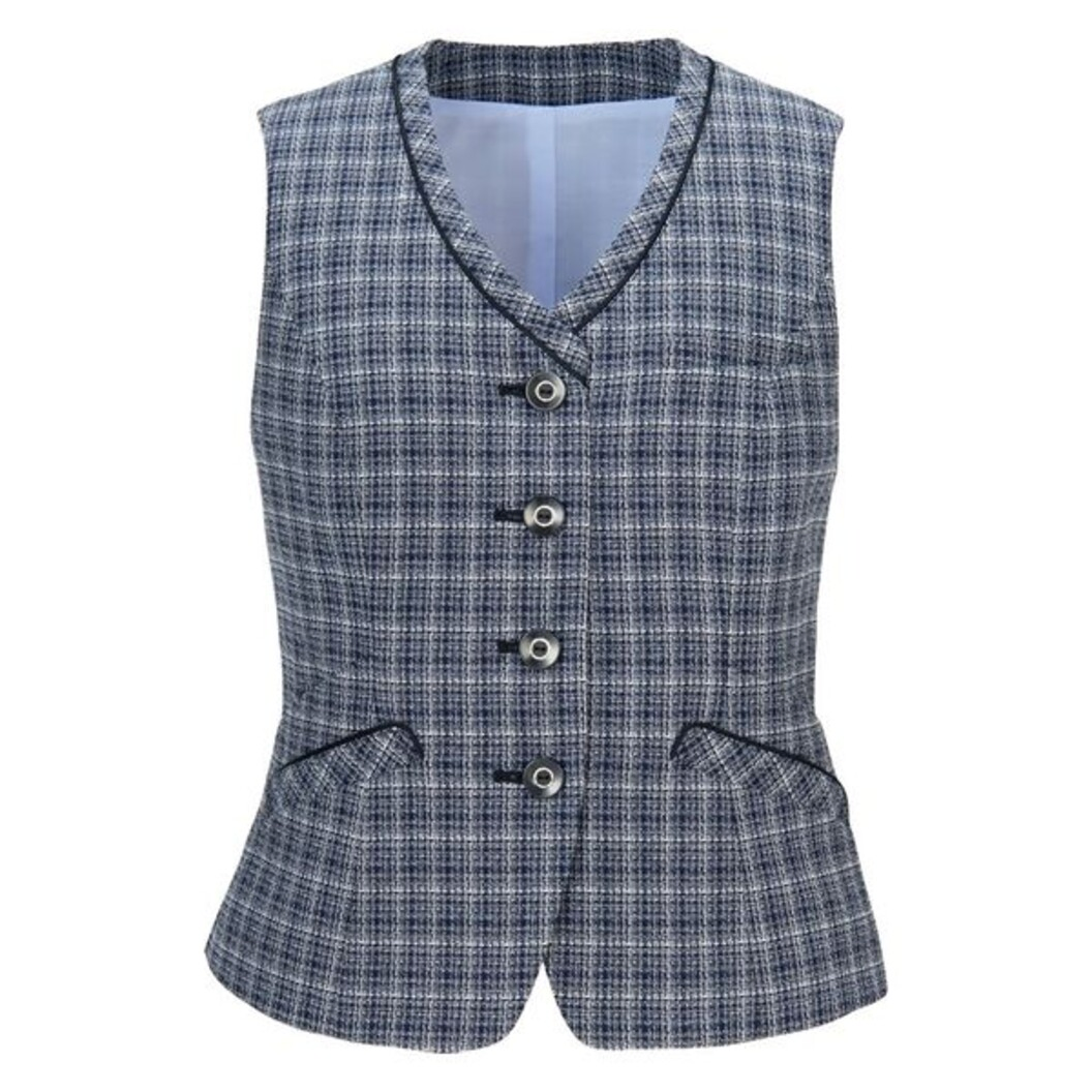 チャーミングベストで顔まわりが明るく華やかに。 毎日快適でいられるうれしい機能が充実しているベストです。 スマホが縦にすっぽり入るスマホポケットを搭載。 抗ウイルス抗菌ポケットで安心を実感。 パイピング使いで顔まわりをシャープに見せる! 素材は着こなしに華やぎをもたらす、多種類の糸を使用し、表情豊かな柄を表現したツイードチェック。 上品でありながら華やかさもあり、コーディネートにおしゃれ感をもたらします。 ナチュラルなストレッチ性があり、快適な着心地です。 ノーブルでやさしい印象のネイビーチェックとフェミニンで華やかな雰囲気のパープルチェックの2色展開。