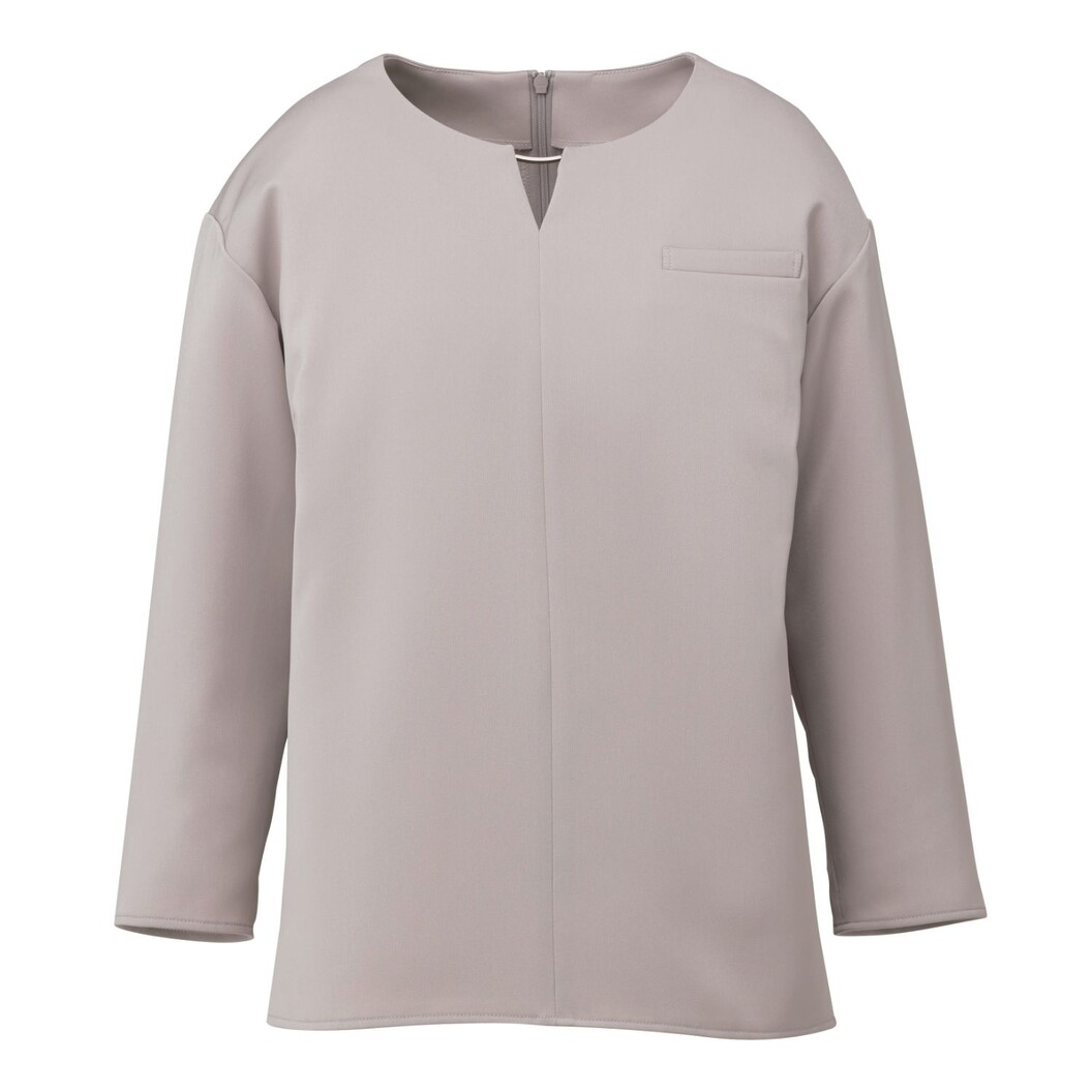 首元にキラリと輝くシルバーパーツがアクセントの華やかなプルオーバーです。 樹木を由来とするトリアセテートと再生ポリエステルで作り出した、まるでシルクのような光沢感とやわらかな風合いのサスティナブル素材を使用しています。 新たな時代のおもてなしを象徴する新鮮なシルエットと色味が魅力のシリーズです。