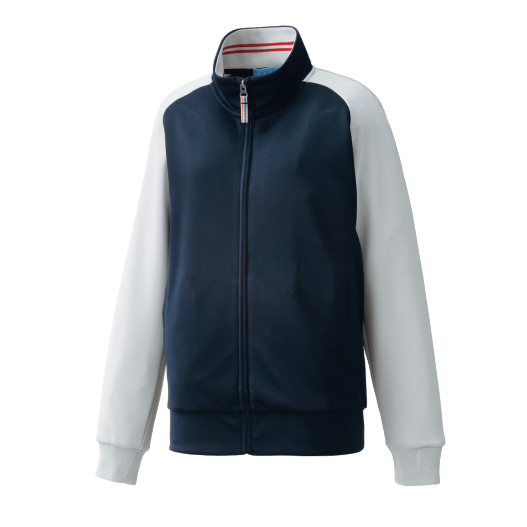 両腰にポケット付きのジャージジャケットです。 裾はリブ編みではなくアウター風のストレート仕上げです。