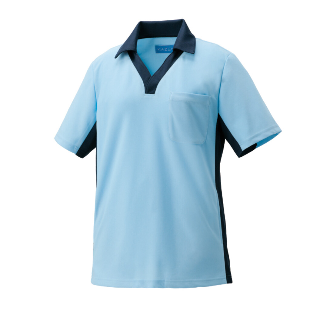 脇の配色切り替えがアクセントのニットシャツです。 着やせ効果もあり、安全性に配慮した、ボタンのないデザインです。