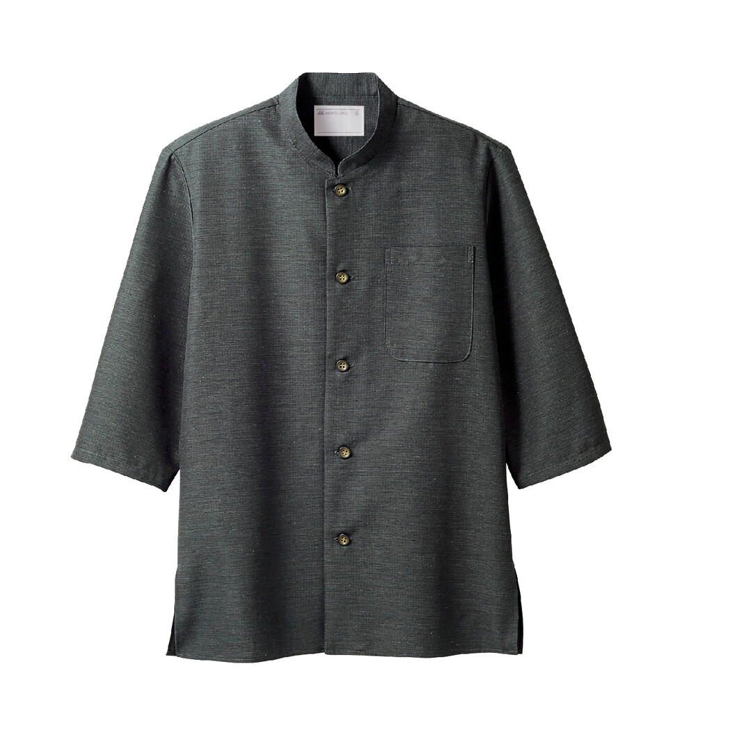 住商モンブランの調理用シャツです。 吸汗速乾性を付与した、男女兼用7分袖、スタンドカラーのシャンタン調が特徴の調理用シャツです。