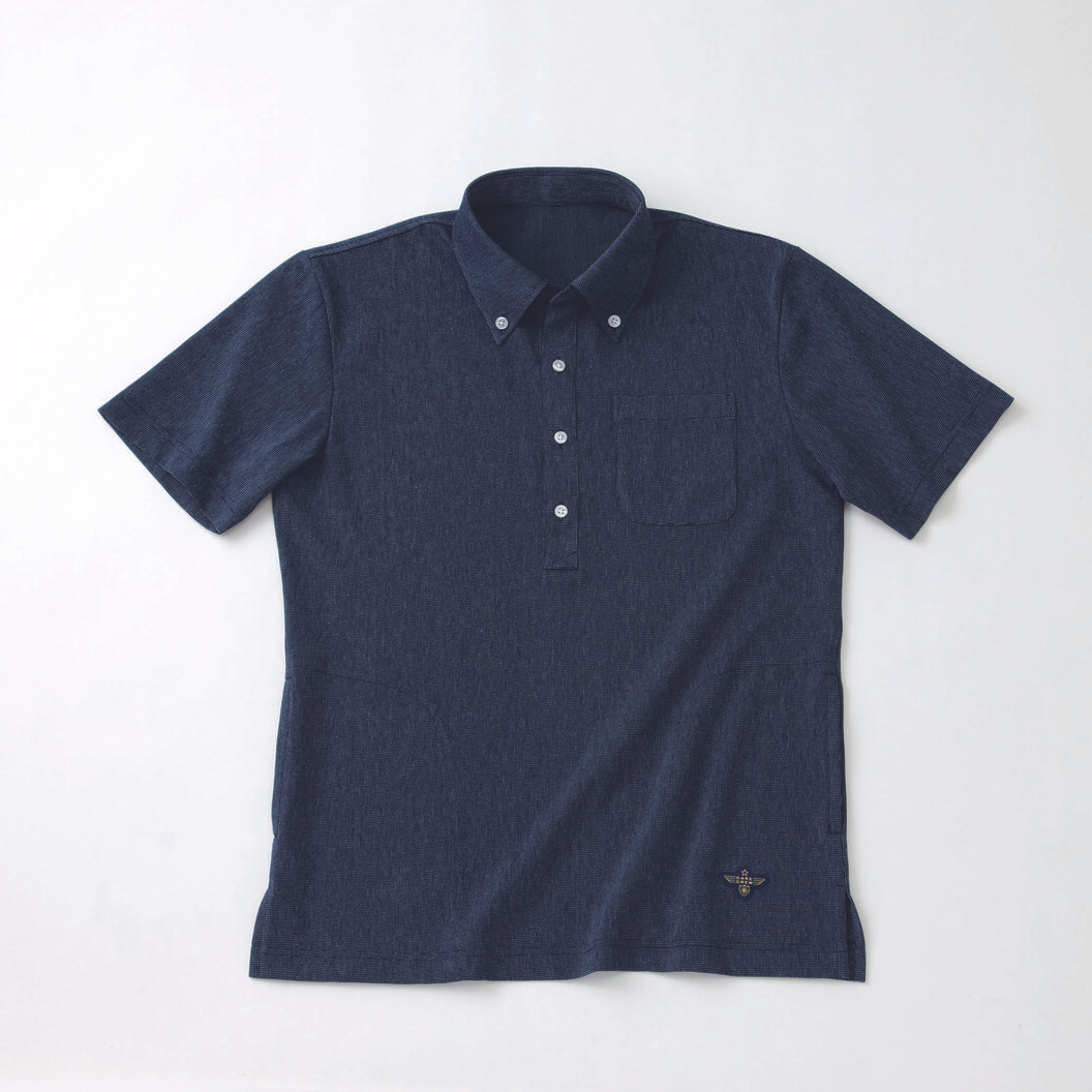 さらっとした風合いで適度なハリ感のあるオーバーシャツ。第一ボタンのないオープンなボタンダウンスタイルで、すっきりと。 特殊なワープニット構造により、すばやく汗を拡散し、蒸れにくい素材です。極めて高い伸縮性能により、運動機能をサポートするとともに、快適な着用感を提供します。特殊仕上により吸水、防汚効果を付加しています。業務用洗濯にも耐えうる形態安定素材です。