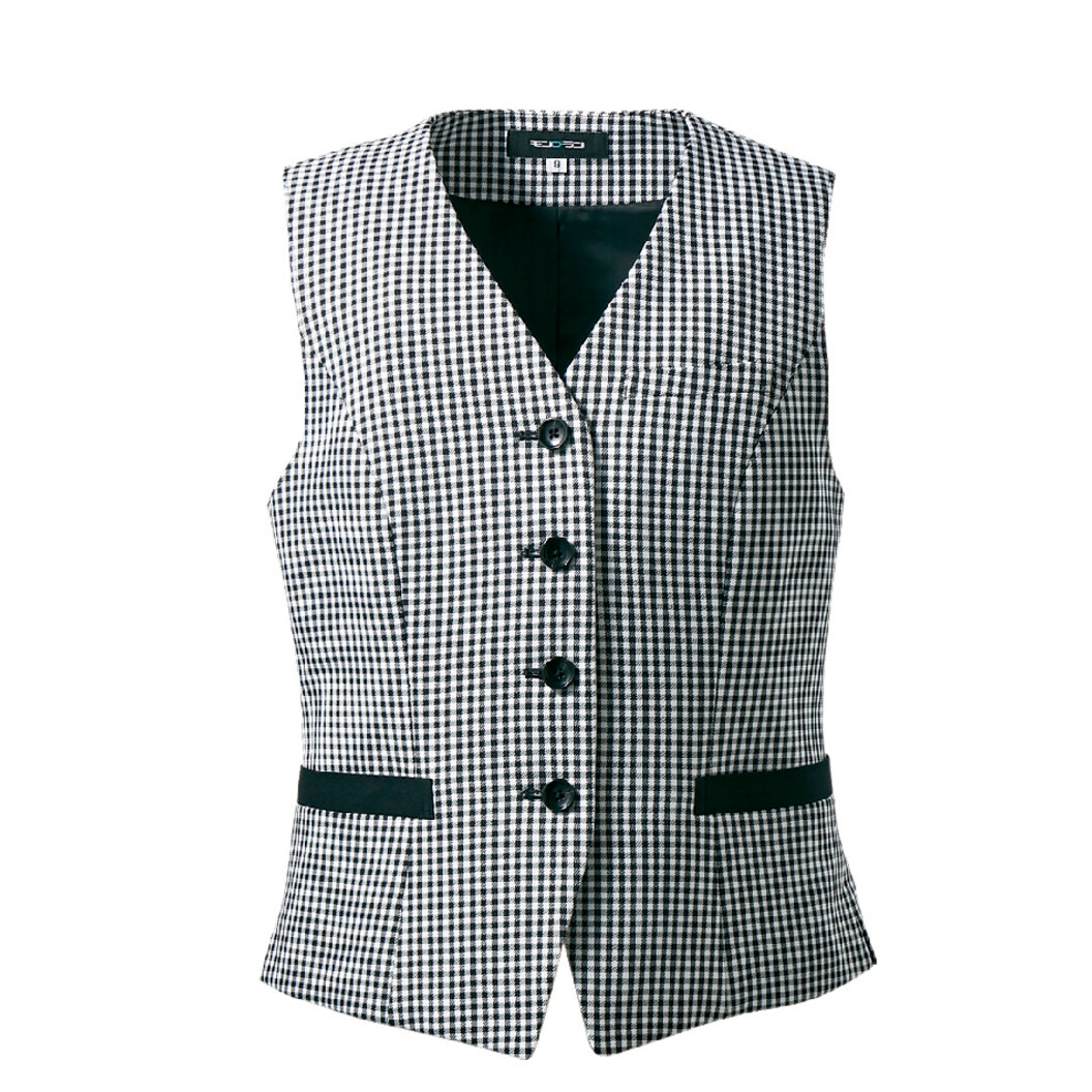 住商モンブランのフォーマル用レディスベストです。 ふっくらと厚みのある素材が、上品な雰囲気を醸し出します。 黒をベースにしたギンガムチェックは、クラシカルな表情とさりげない気品が魅力。 ウエストをしぼったすっきり美しいシルエットで、スタイリッシュに着こなせます。 黒いボタンと、腰ポケットの位置にあしらった黒いテープが、ほどよいアクセントに。 バックスリット入りで腰まわりの窮屈感がなく、立ち座りもスムーズ。すべりの良い裏地付きです。
