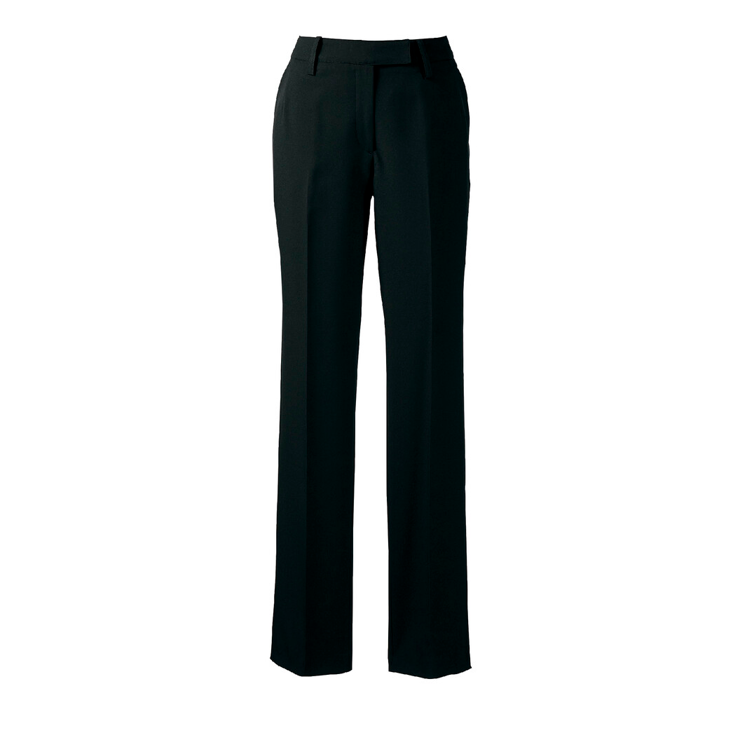 住商モンブランのフォーマル用レディスパンツです。 脚のラインが出にくい、裏地が付いたほどよい厚みの素材です。 ノータックのストレートシルエットで、すっきり脚長に。 高めの位置につけた箱ポケットは、ヒップアップ効果も期待できます。 ウエスト部分は、動いてもシャツが出にくい斜めのライン。 だらしなく見えず、いつもきちんとした印象をキープします。 レディスはカーブベルト採用で、ウエストラインをシャープに演出。 動きやすい快適なはき心地と、美しいシルエットを両立した、優秀パンツです。
