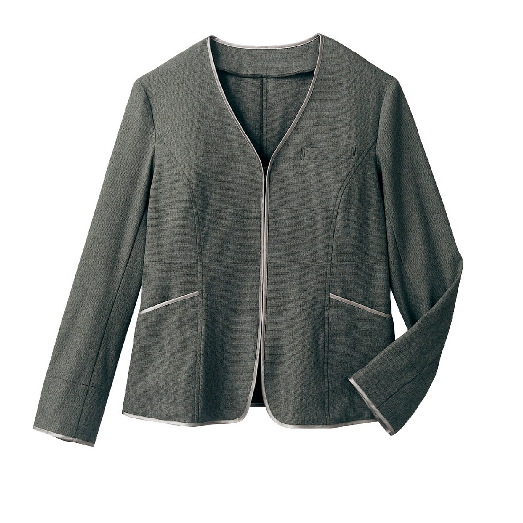 住商モンブランのレディスジャケットです。 ストレッチが効いたやわらかなニット素材だから、ジャケットの窮屈感や締め付け感が苦手な方も快適に着られます。 コンパクトなVネックのシンプルなデザインに、パイピングをあしらってアクセントをプラス。 フロントはジップアップで、閉めてジャケット風に、開けてカーディガン風にと、表情の違う着こなしが楽しめます。 カラーは、親しみとやさしさを感じさせる上品なグレー。 両サイドには、スマホがおさまる実用的なサイズのポケットが付いています。