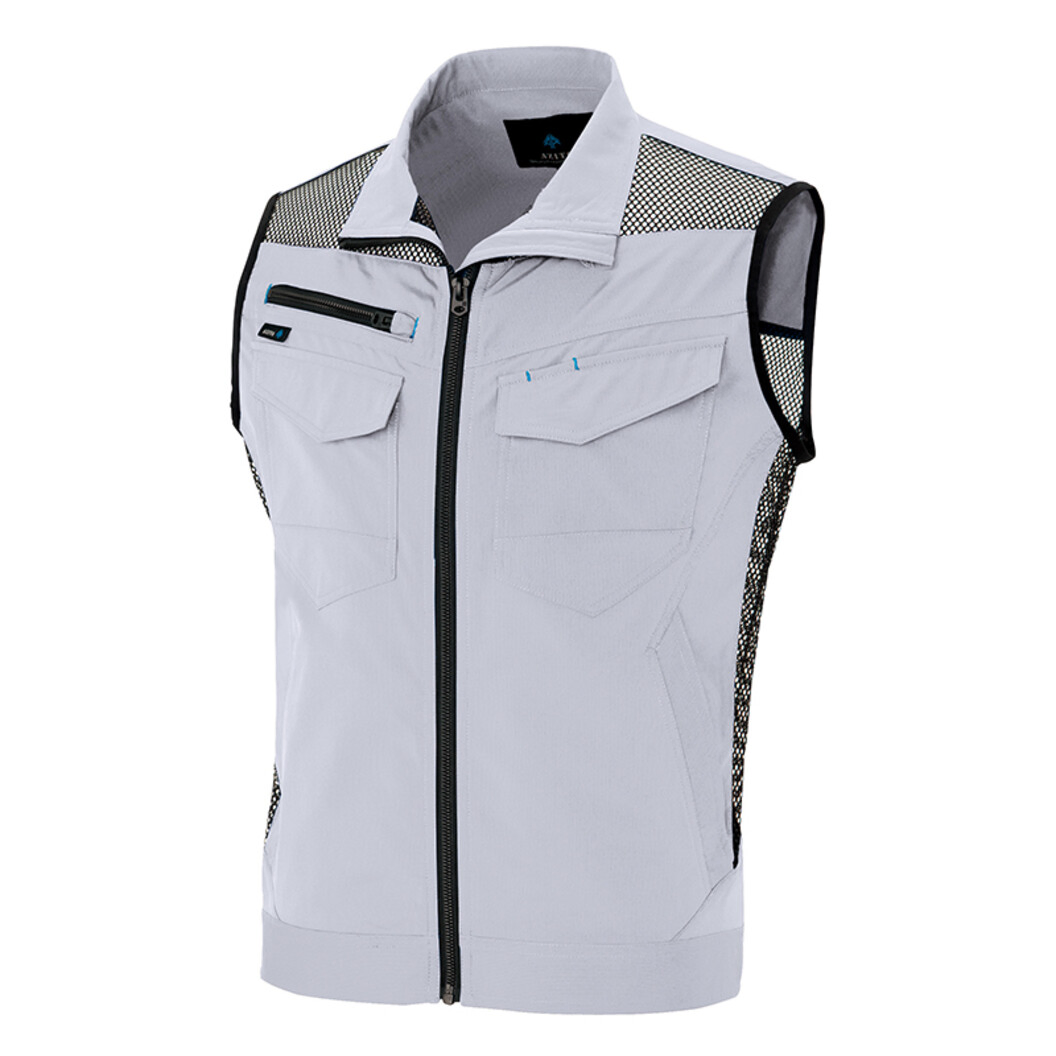 軽量で通気性に優れたワークベストです。背中部分はメッシュ素材で、蒸れにくくなっています。スタンドカラーで首元をすっきりと見せてくれます。ファスナー付きポケットとペン差し付きポケットがあり、小物の収納も可能です。