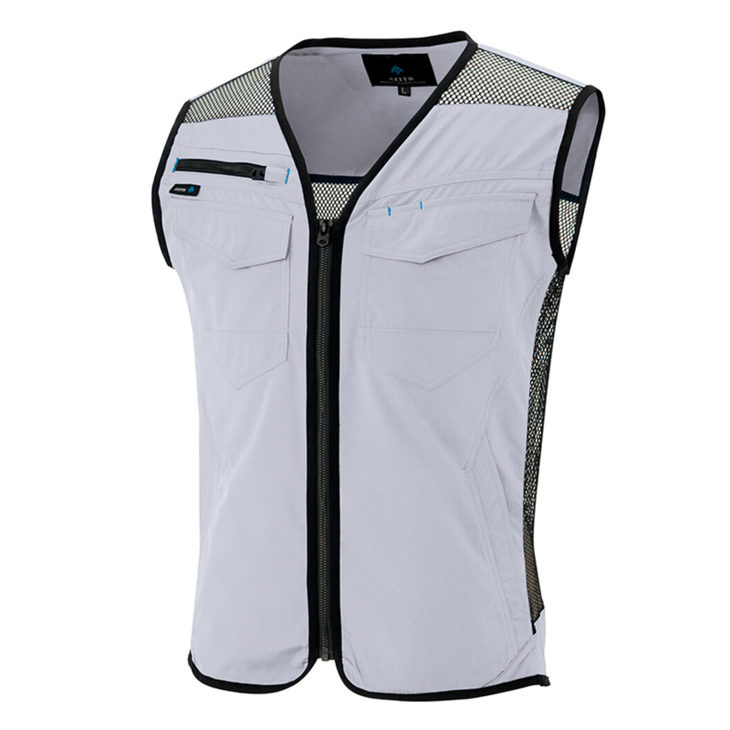 Vネックのデザインで、首元がスッキリとしています。 前面には2つのポケットが付いており、小物類を収納することができます。 通気性と吸汗性に優れています。作業着としてはもちろん、普段着としても着用できる汎用性の高いベストです。