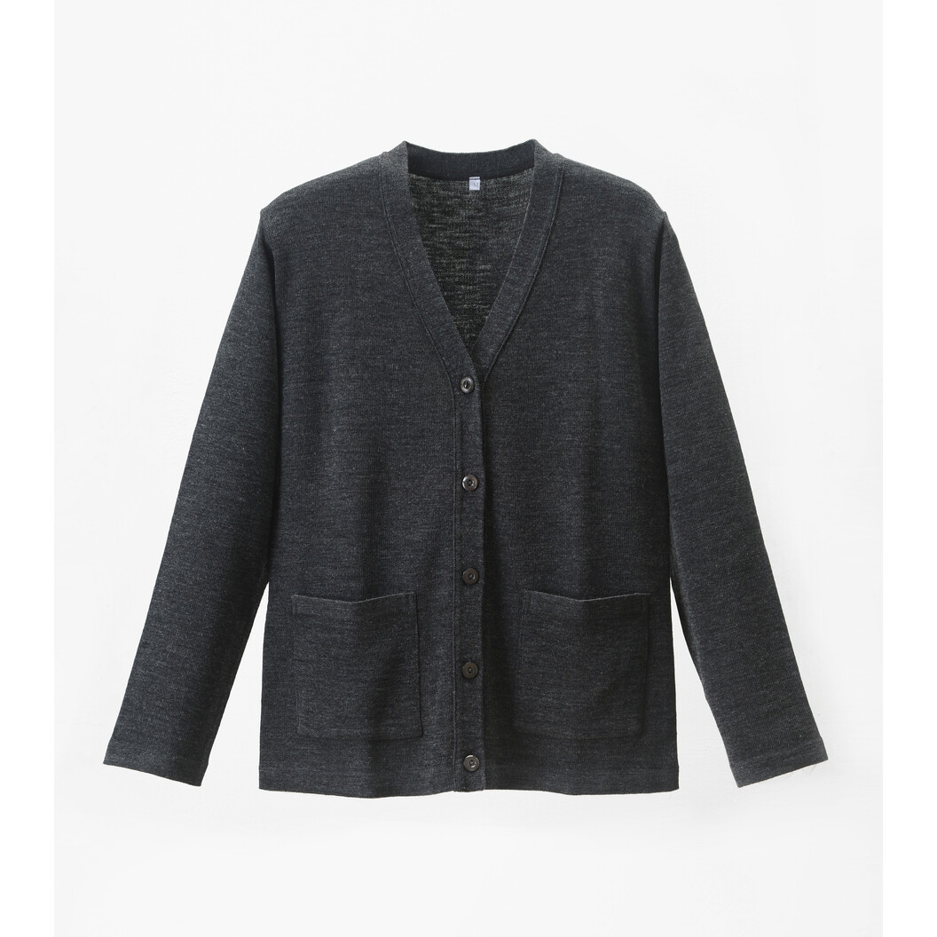 ポケット付筒袖でオフィスでの着用にピッタリのカーディガンです。 Vゾーンは当社のその他商品よりMサイズで約7cm浅くなっています。 素材・縫製ともに安心の日本製で毛玉が出来にくい抗ピル加工と静電気防止加工を施しています。