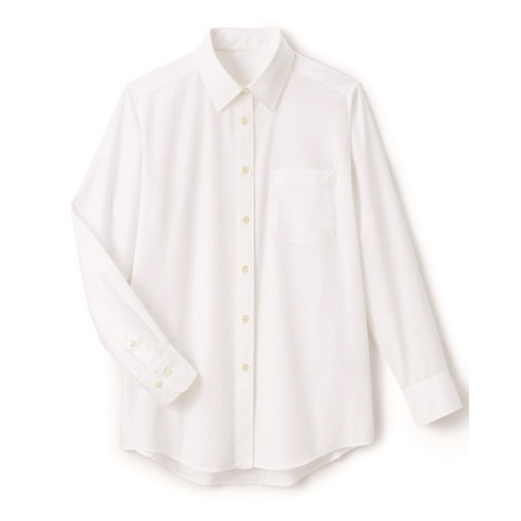 汎用性の高い定番の長袖ブラウス。スッキリとしたシルエットと動きやすさが特長です。オフ白、台衿付きシャツカラーで、腕が動かし易いように袖のパターンを改良しました。左胸にパッチポケット、袖口カフスにはサイズ調節できるように2つボタンが付いています。前立て下部には替えボタン付き。