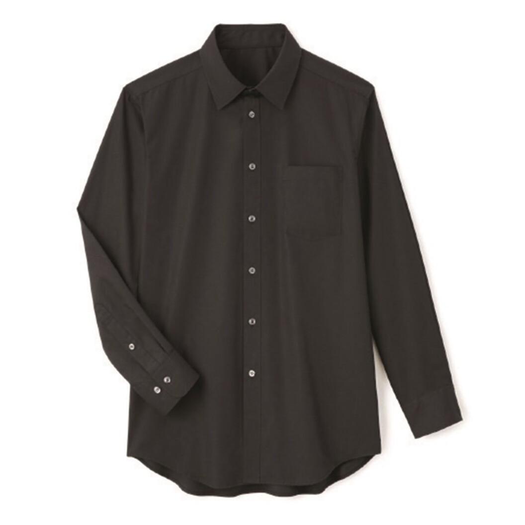 汎用性の高い定番の長袖シャツ。黒、台衿付きシャツカラー、後ヨーク切替にタックが入っています。左胸にパッチポケット、袖口カフスにはサイズ調節できるように2つボタンが付いています。前立て下部には替えボタン付き。