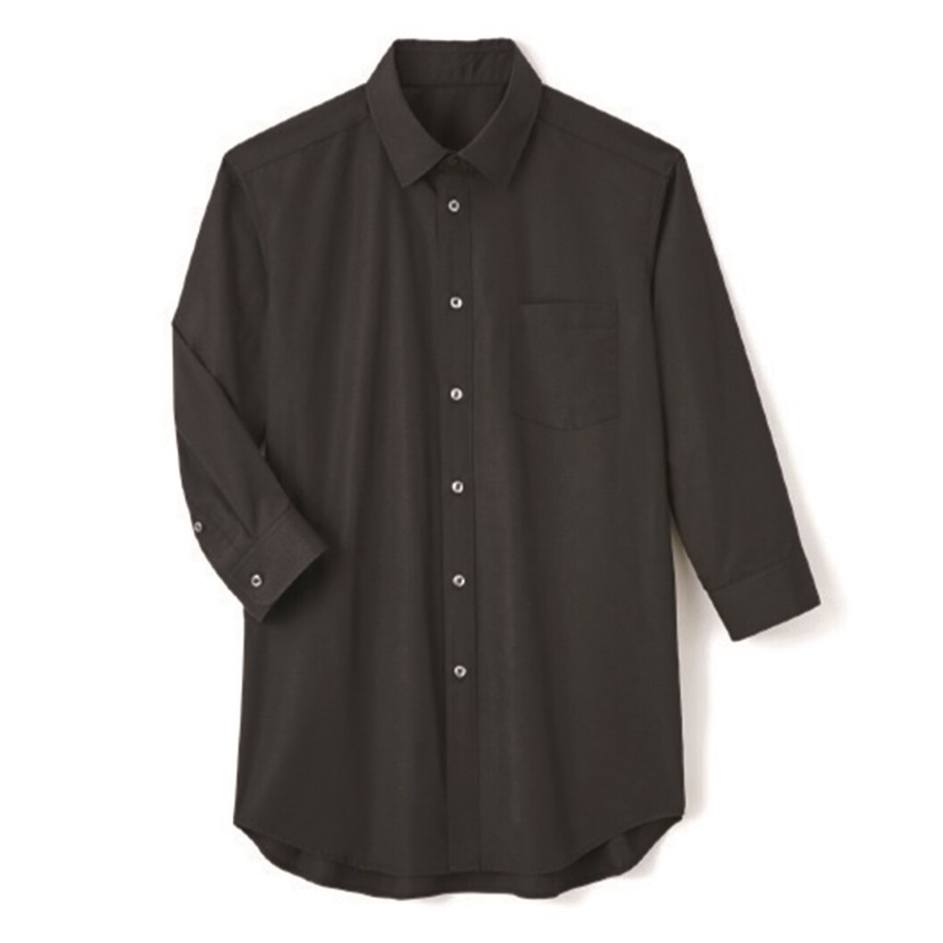 汎用性の高い七分袖のシャツ。黒、台衿付きシャツカラー、後ヨーク切替にタックが入っています。左胸にパッチポケット、袖口はカフス付きです。前立て下部には替えボタン付き。