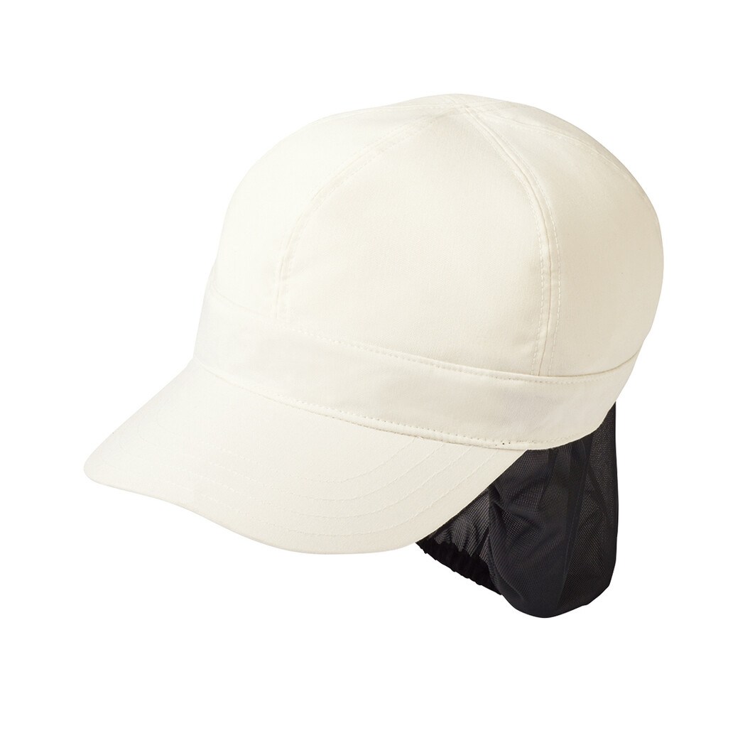 毛髪、体毛落下防止ネット付き帽子、HACCP支援アイテムです。年齢を問わず着用しやすいキャップデザインで、後ろにはゴムが入っていて3cm伸びます。オフホワイト、ネイビーの2色展開で幅広いシーンで着用していただけます。