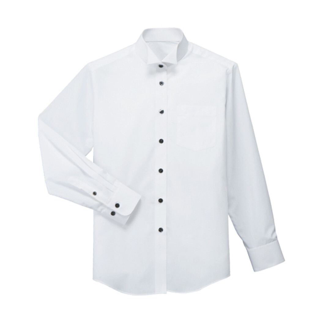 従来に比べ、衿を高くし、固めにしっかりとさせたウィングカラーシャツ。衿の後ろには蝶ネクタイを安定させる為のループ付き。グレーのボタンがアクセントになるので蝶ネクタイがなくでも着用可能です。