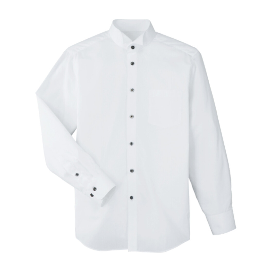 従来に比べ、衿を高くし、固めにしっかりとさせたウィングカラーシャツ。衿の後ろには蝶ネクタイを安定させる為のループ付き。グレーのボタンがアクセントになるので蝶ネクタイがなくでも着用可能です。