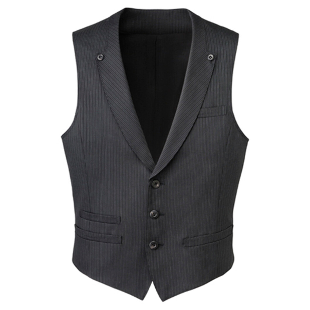 深めのVネックと変形ヘチマカラーが特徴的なデザインのベスト。控えめな光沢感のあるストライプ柄が高級感を演出します。バックにはサイズ調整可能な背ベルト付き。