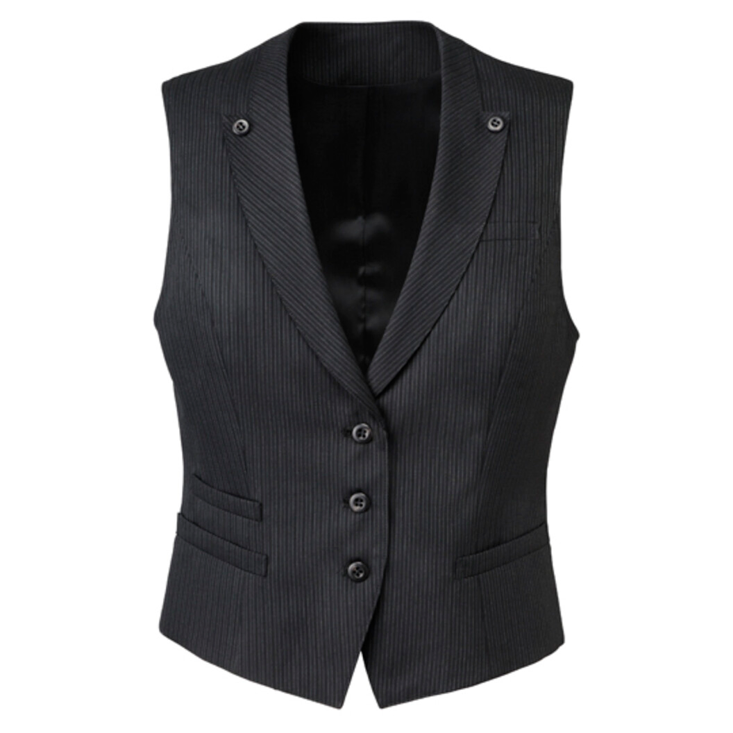 深めのVネックと変形ヘチマカラーが特徴的なデザインのベスト。控えめな光沢感のあるストライプ柄が高級感を演出します。バックにはサイズ調整可能な背ベルト付き。