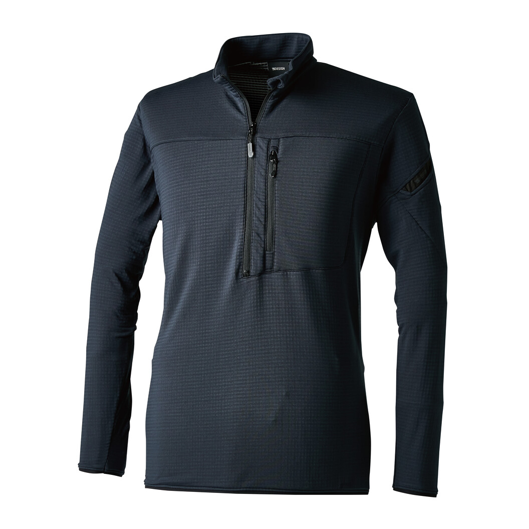 通気+裏起毛で適度に暖かい新素材のハーフジップです。ハーフジップタイプはジップを最上部まで上げた際にファスナー部分が当たらないようにチンガードを採用しています。左胸には小物を収納できるファスナーポケット付きです。左胸ファスナーポケット付き、マルチスリーブポケット付き、袖口・裾ストレッチバインダー、縫製糸により静電気もケアしています。