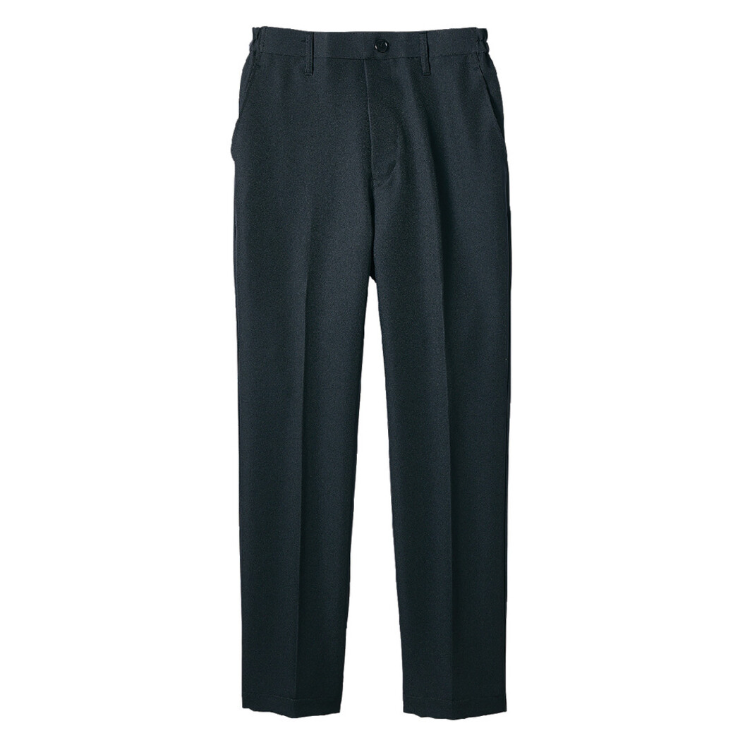 すっきり細身の男女兼用ストレートパンツです。シャツが出にくいパターン設計で、しゃがんだときも安心です。ノータック・ウエスト両脇ゴム仕様。両脇と後ろ左右にポケット付き。