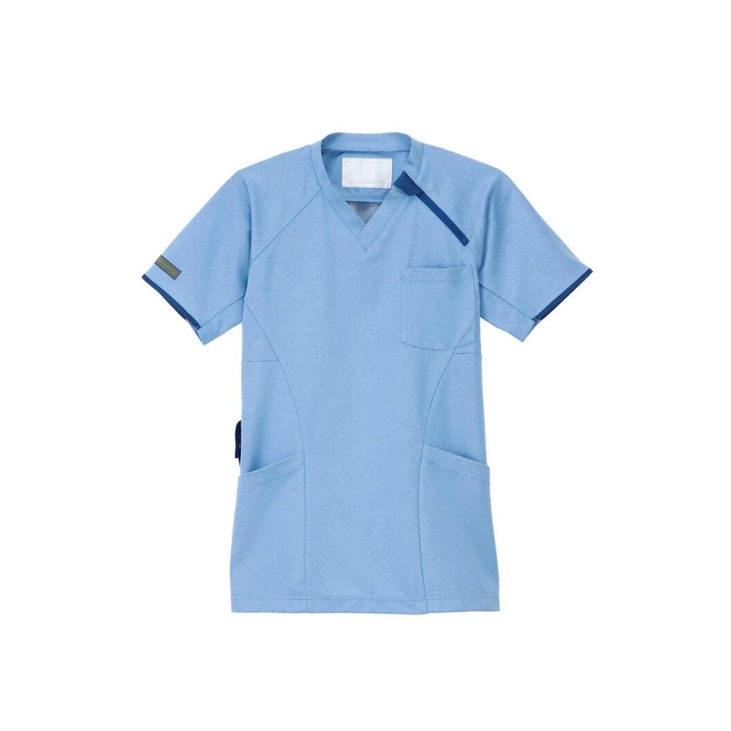 エアーアームカットを採用しゆったりしたシルエットで非常に動きやすいスクラブタイプのデザインです。斜めに付いたカラーファスナーがポイントです。高い通気性を誇る杢調の素材がやさしい印象です。(意匠登録済)(Wループ:意匠登録済) 汗を吸い上げる性能に優れ、肌側をサラサラに保つ素材です。気化熱促進繊維により発汗時に涼感効果を発揮します。速乾性に優れているため汗で濡れても早く乾きます。通気性の良い素材です。特殊仕上により吸水、防汚効果を付加しています。