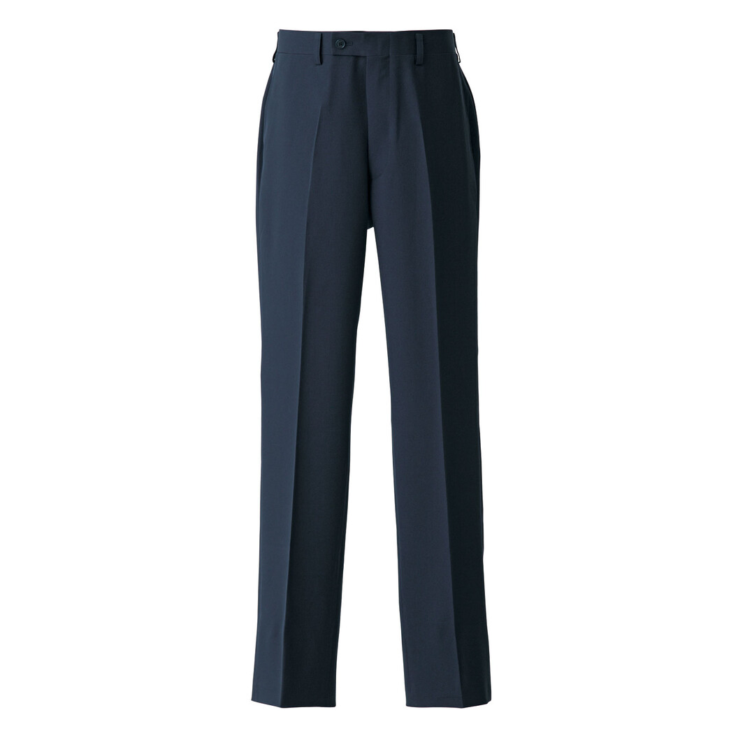 トップ調の梳毛高級スーツ生地に見えるポリエステル100%素材です。ストレッチもあり着心地は快適です。デザインはスーツ合わせのベーシックスラックスですのでホテル・レストランの多くのシーンで着用出来ます。パンツ裾はフリーの状態ですので丈のお直しが必要になります。同素材のベストもあります。制電糸入り。95cmよりワンタックです。