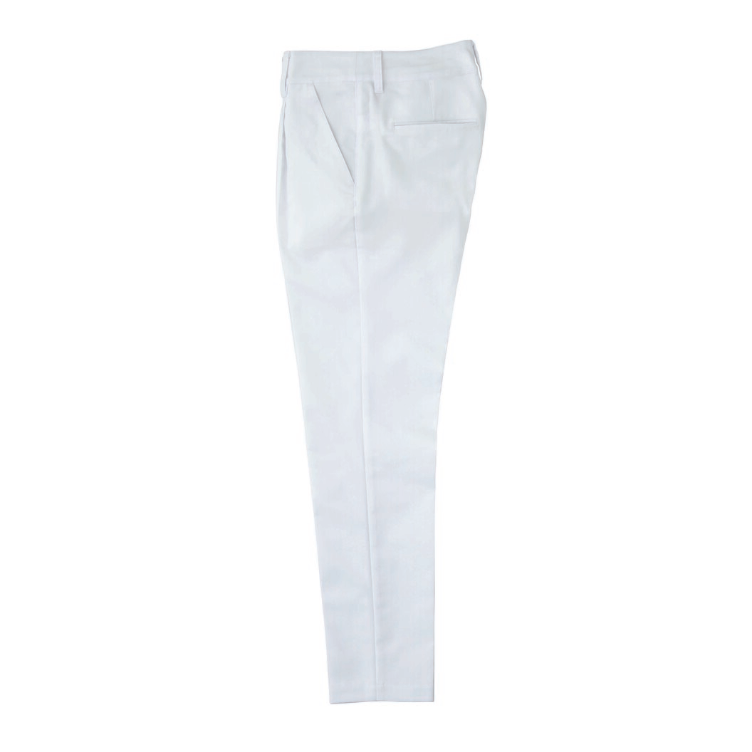 毛混ではないスーツ合わせのパンツを開発しました。ポリエステルと綿で出来たツイルパンツです。ほのかなストレッチ、制電糸入り、白のみSR(汚れ落ちやすい)機能あり。テーパードし、細身のシルエット、モダンな欧州高級スーツと合わせるパンツのようなシルエットです。とてもスタイル良く映ります。生地感は最初はハードですが、履きこなしていくうちに馴染んできます。同素材のジャケット(DD2765)がありますのでスーツとしての着用も出来ます。これからの新しいカジュアル寄りのコンセプトを提案しているホテルやレストランにオススメです。