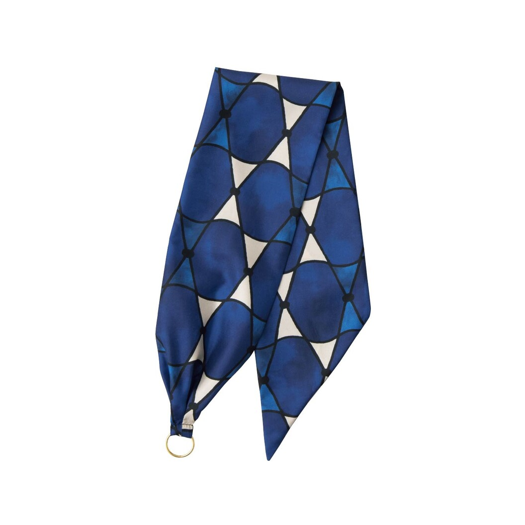 シルク風合いのスカーフです。大胆な幾何柄でカラーも強く、コーディネートにアクセントが出ます。リングが付いていますので、簡単に色々な巻き方が出来ます。