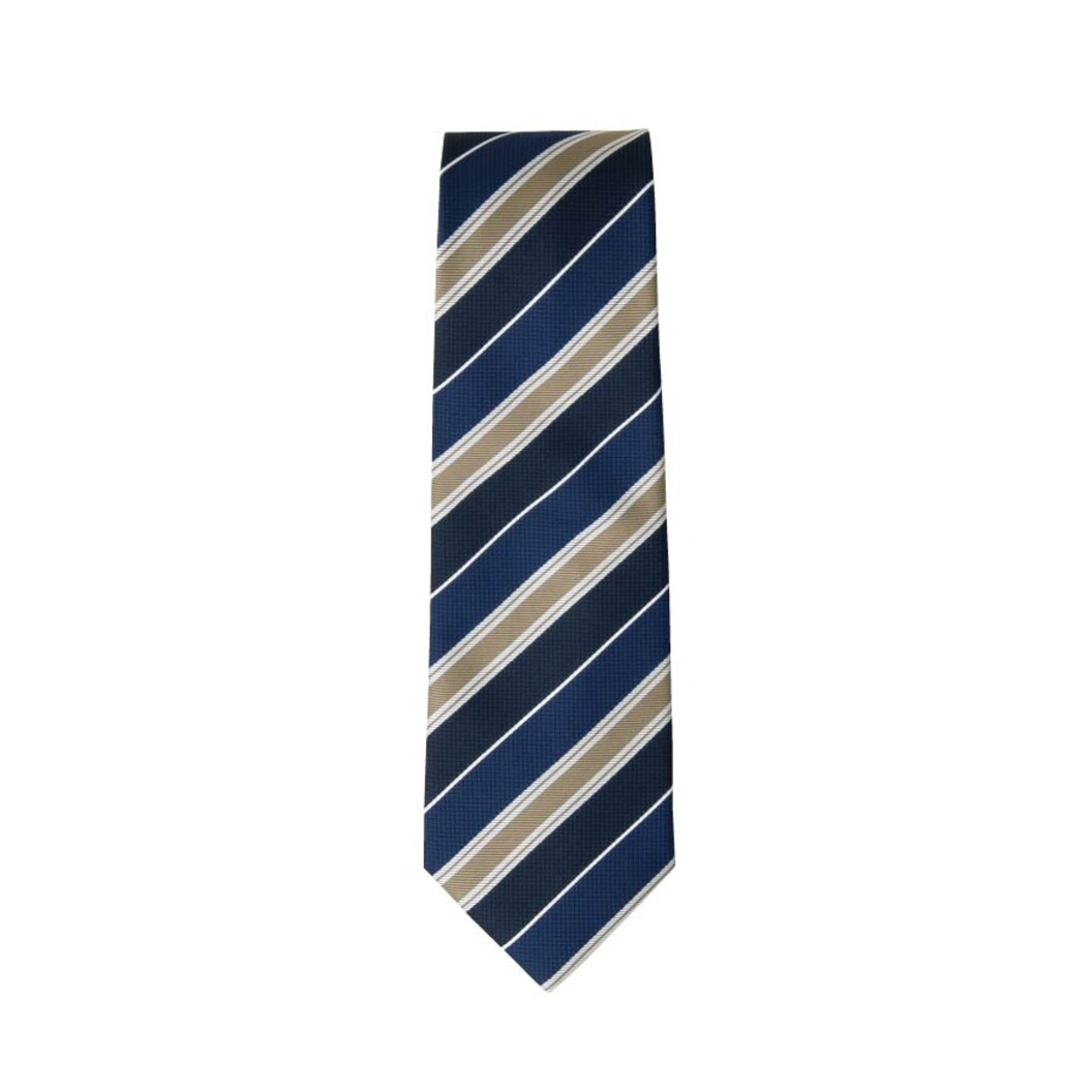 イギリスの伝統的な連隊旗縞から生まれレジメンタル・ストライプという柄名で呼ばれている。わかりやすい柄ですのでユニフォームらしい視認性と連帯感が醸し出される。ポリエステル100%ですので、扱いが楽でシルクより耐久性は高い。